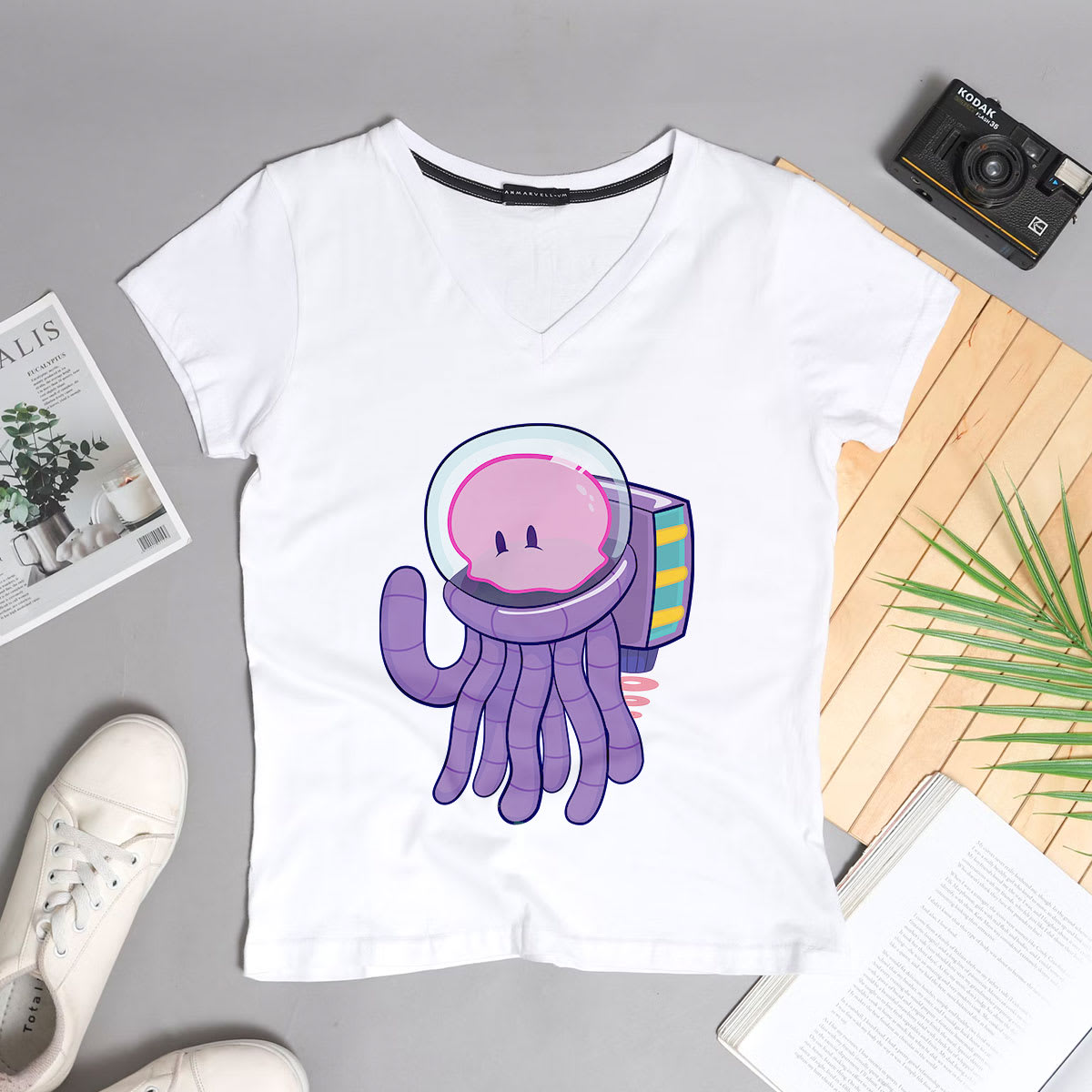 Cosmo's coming along for the ride in this flattering V-Neck cut tshirt.
